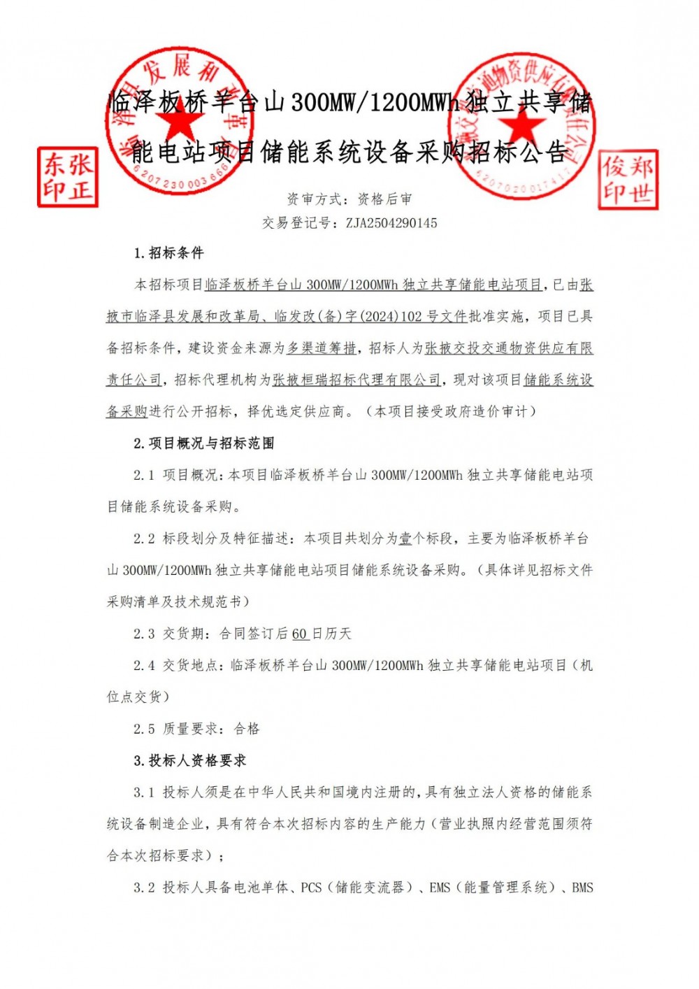 4月29日,张掖交投交通物资供应有限责任公司发布临泽板桥羊台山300MW/1200MWh独立共享储能电站项目储能系统设备采购招标公告,建设资金来源为多渠道筹措。