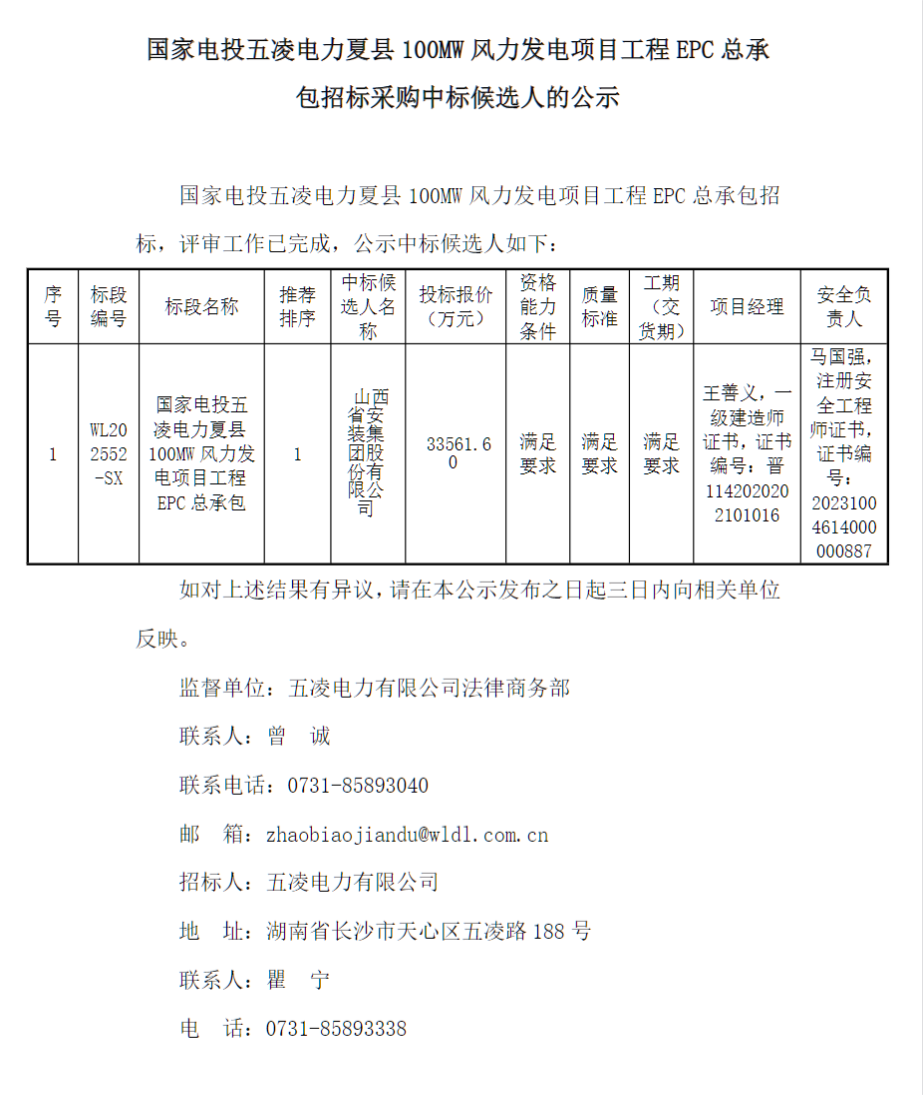 根据公示,山西省安装集团股份有限公司作为第一中标候选人预中标国家电投五凌电力夏县 100MW风力发电项目。