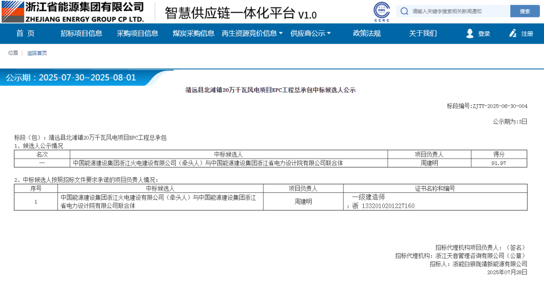 中国能源建设集团浙江火电建设有限公司(牵头人)与中国能源建设集团浙江省电力设计院有限公司联合体作为第一中标候选人预中标靖远县北滩镇20万千瓦风电项目。