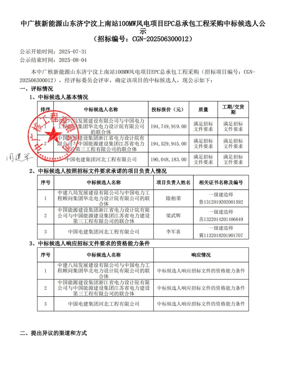 中建八局发展建设有限公司与中国电力工程顾问集团华北电力设计院有限公司的联合体作为第一中标候选人预中标中广核新能源山东济宁汶上南站100MW风电项目。