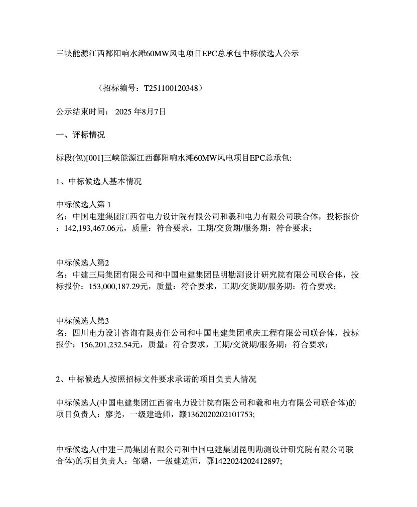 电力家获悉,8月4日,三峡电子商务平台公示三峡江西鄱阳响水滩60MW风电项目EPC总承包中标候选人。项目有三个联合体成功入选。