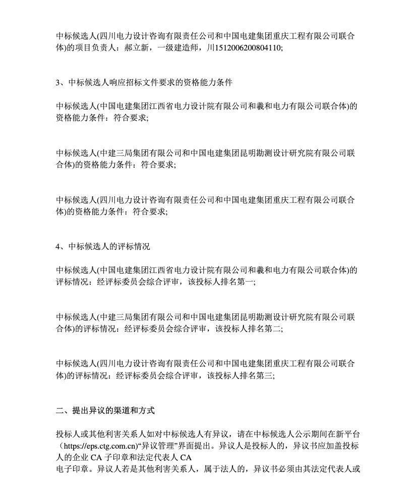 中国电建集团江西省电力设计院有限公司和羲和电力有限公司联合体是第一候选人,其报价是:14219万元,约合单价为2370元/kW;