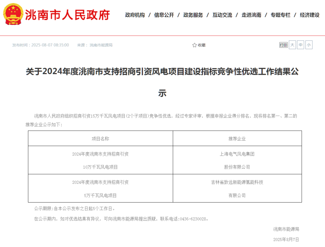 根据公示,上海电气风电集团股份有限公司、吉林省致远新能源氢能科技有限公司中选。