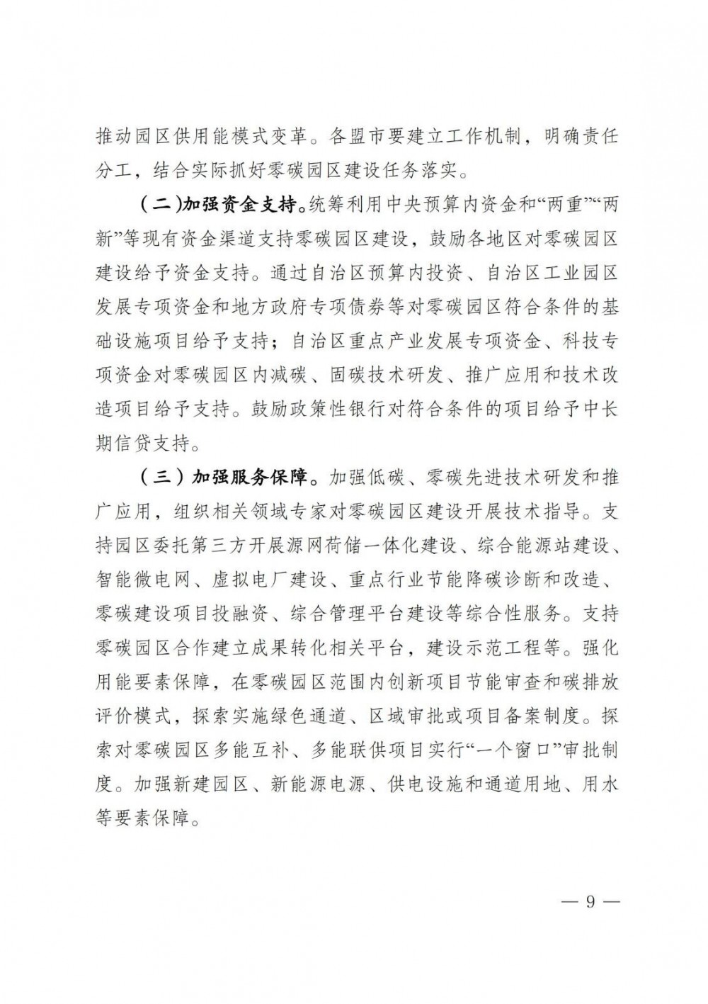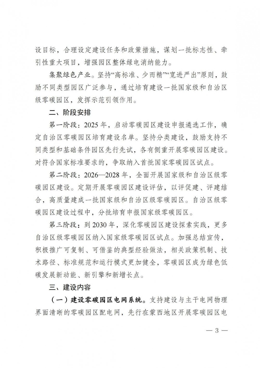 内容指出,推动项目落地。准确把握零碳园区定位,聚焦零碳园区建设目标,合理设定建设任务和政策措施,谋划一批标志性、牵引性重大项目,增强园区整体绿电消纳能力。集聚绿色产业。坚持“高标准、少而精”“宽进严出”原则,鼓励不同类型园区广泛参与,通过培育建设一批国家级和自治区级零碳园区,发挥示范引领作用。
