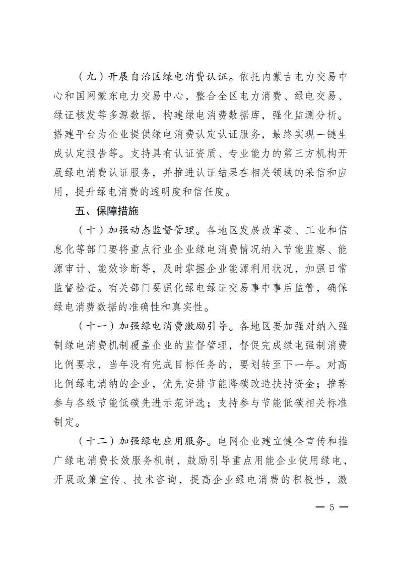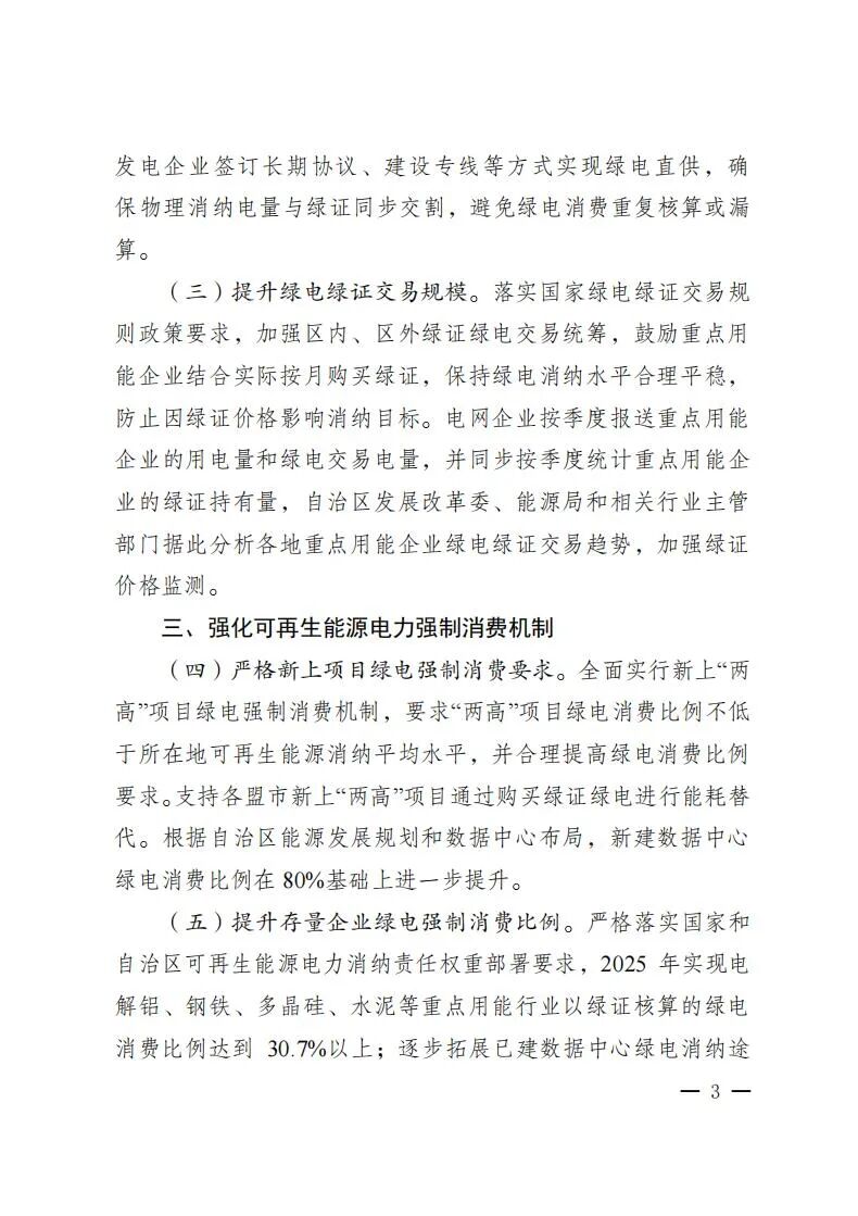 文件提出,严格新上项目绿电强制消费要求。全面实行新上“两高”项目绿电强制消费机制,要求“两高”项目绿电消费比例不低于所在地可再生能源消纳平均水平,并合理提高绿电消费比例要求。支持各盟市新上“两高”项目通过购买绿证绿电进行能耗替代。根据自治区能源发展规划和数据中心布局,新建数据中心绿电消费比例在80%基础上进一步提升。