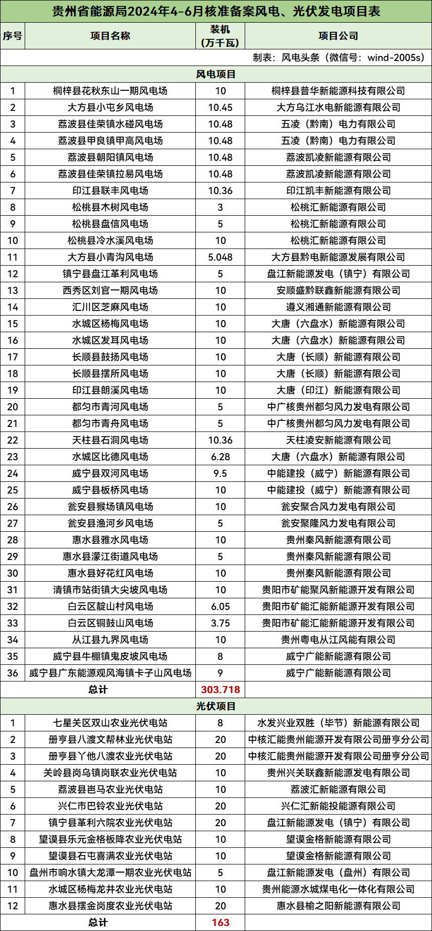 根据项目表,贵州省能源局2024年4-6月核准备案风电、光伏发电项目48个,总装机466.718万千瓦。其中,风电项目36个,总装机303.718万千瓦;光伏项目12个,总装机163万千瓦。