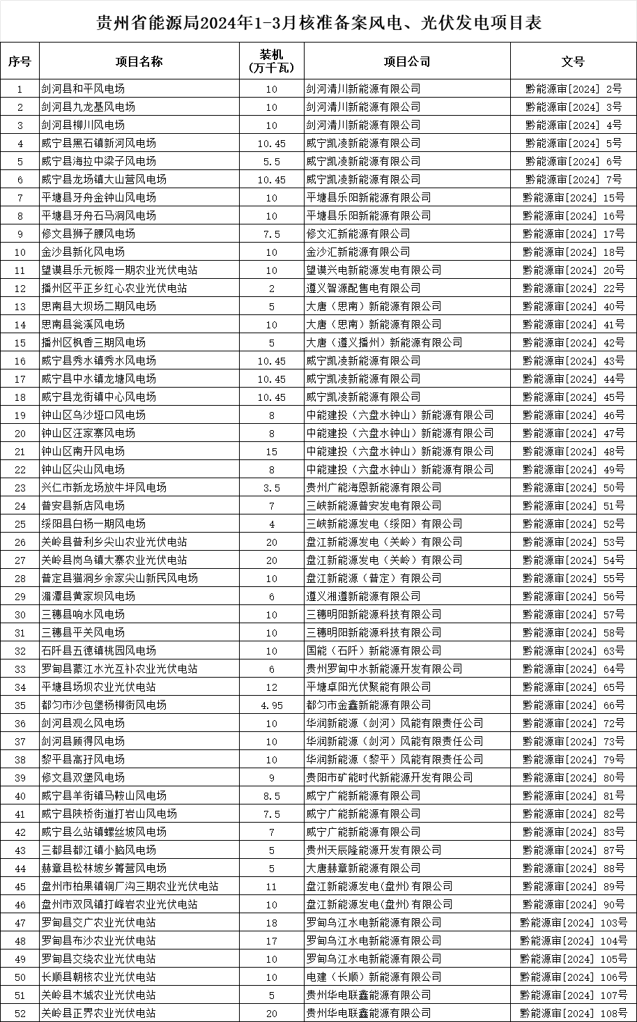 根据《省人民政府关于印发贵州省企业投资项目核准和备案管理办法的通知》(黔府发〔2018〕第7号),按照程序,贵州省能源局2024年1-3月核准备案风电、光伏发电项目52个,现将有关情况公布如下。