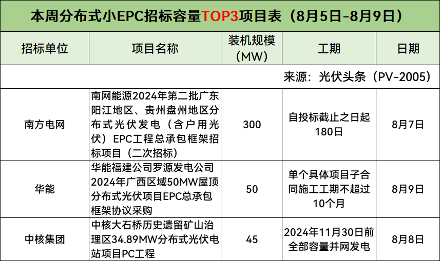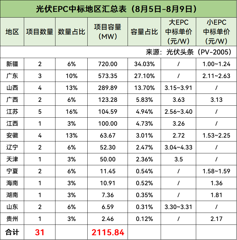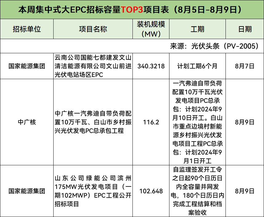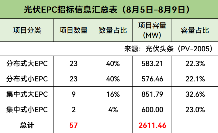对8月第1周(8月5日-8月9日)光伏EPC招/中标项目不完全统计,本周招标规模合计2611.46MW,中标规模合计2115.84MW,招中标规模合计4727.30MW。
