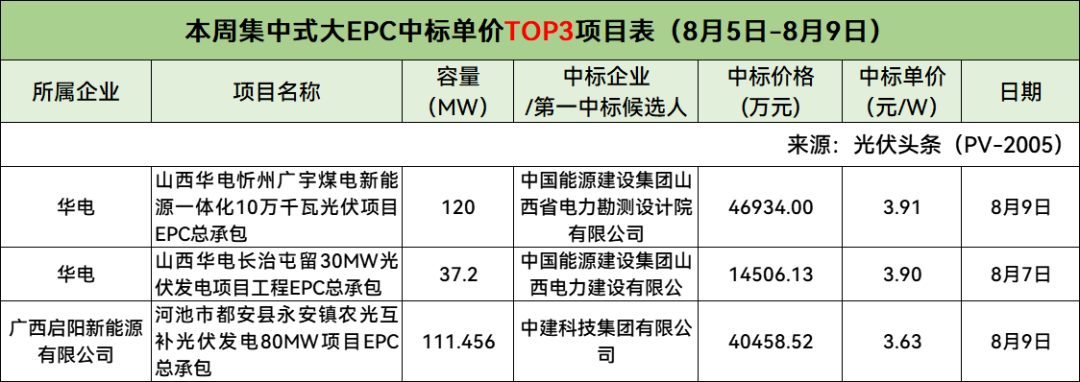 本周集中式大EPC中标单价最高项目是山西华电忻州广宇煤电新能源一体化10万千瓦光伏项目EPC总承包。项目交流侧100MW(直流侧120MWp),配置储能电站20MW/40MWh。项目招标内容包含勘察设计、设备材料采购、建筑安装工程等。其中建筑安装工程含220kV升压站工程、集电线路工程、光伏阵区、储能电站工程施工、道路工程(含场内检修道路、临时道路、施工便道等)、原忻州广宇电厂#4机组发电机-变压器-线路组屋外配电装置拆除、设备安装调试、试验(一、二次设备安装、调试及试验、涉网试验)、验收、并网发电。