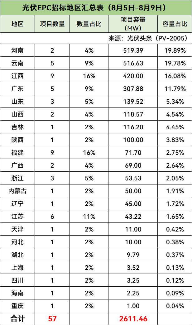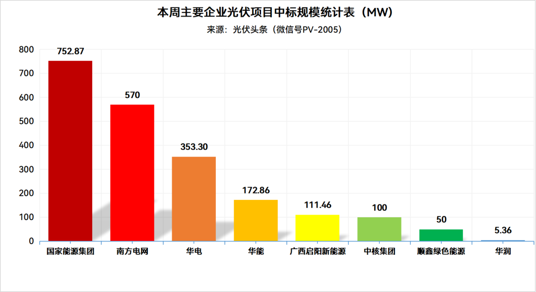统计,本周国家能源集团、华电、南方电网、华能、中广核、中核集团、三峡、大唐、京能集团等企业发布了57个光伏招标项目,装机规模合计2611.46MW。