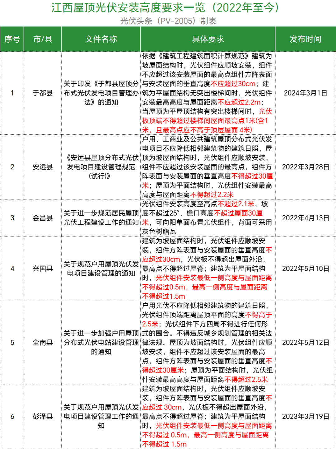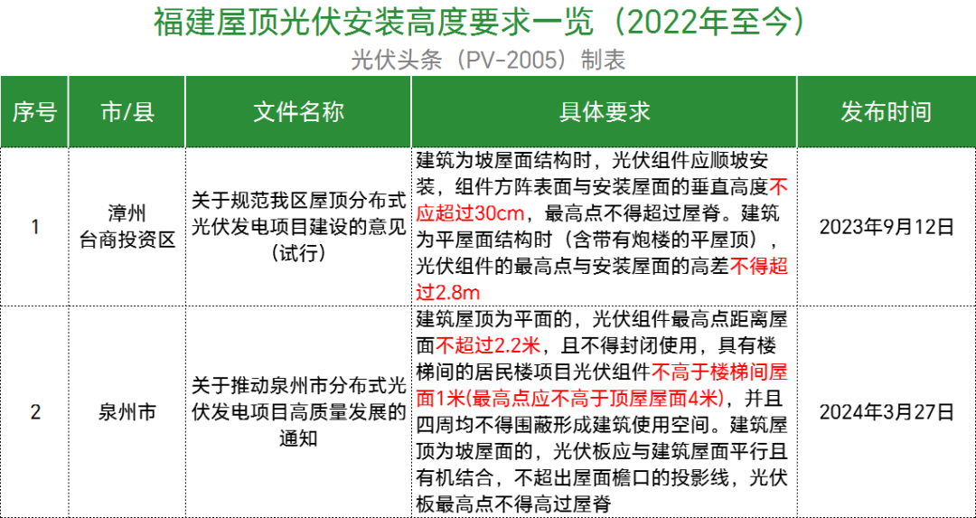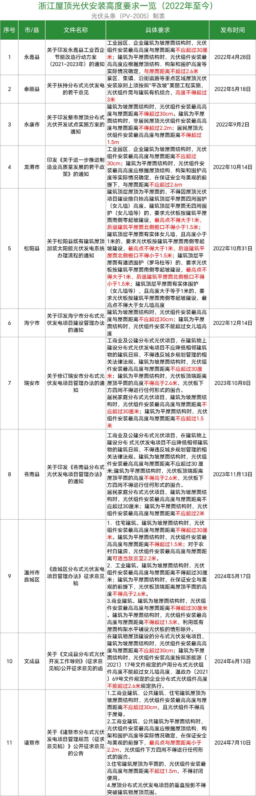 统计,2022年至今,安徽芜湖市繁昌区、福建漳州台商投资区、福建泉州市、广东佛山顺德区、广东珠海市、广东中山市、广东东莞市、广东深圳市、广东韶关市、广东潮州潮安区、广东罗定市、广西南宁市、广西岑溪市、广西德保县、贵州丹寨县、湖北宜昌市、湖北通山县、湖南岳阳县、江苏镇江市、江西于都县、江西安远县、江西会昌县、江西兴国县、江西全南县、江西彭泽县、山西稷山县、陕西西安市、陕西平利县、云南曲靖市、浙江松阳县、浙江永嘉县、浙江泰顺县、浙江苍南县、浙江瑞安市、浙江永康市、浙江龙港市、浙江海宁市、浙江温州市鹿城区、浙江文成县、浙江诸暨市40地出台相关政策,对屋顶光伏安装高度要求进行规范。