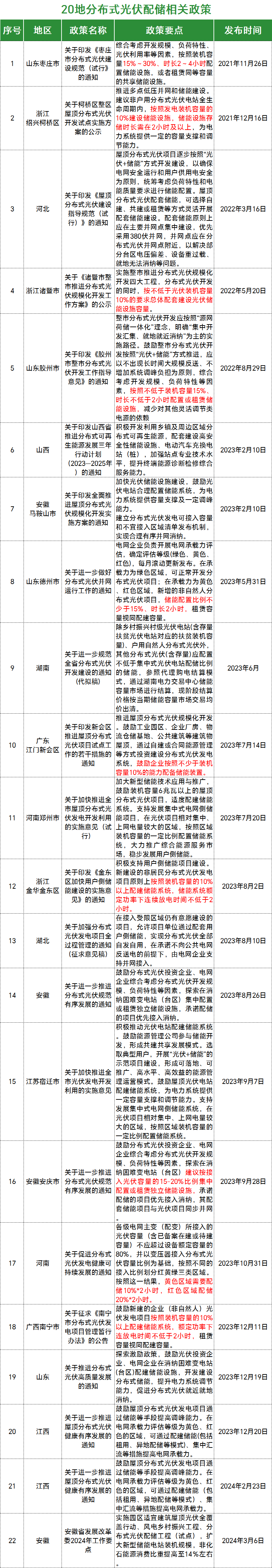 据统计,2021年至今,安徽、安徽安庆市、安徽马鞍山市、广东江门新会区、广西南宁市、河北、河南、河南郑州市、湖北、湖南、江苏宿迁市、江西、山东、山东德州市、山东胶州市、山东枣庄市、山西、浙江金华金东区、浙江绍兴柯桥区、浙江诸暨市20地发布分布式光伏配储政策。