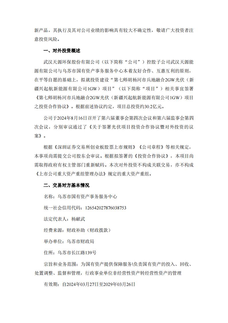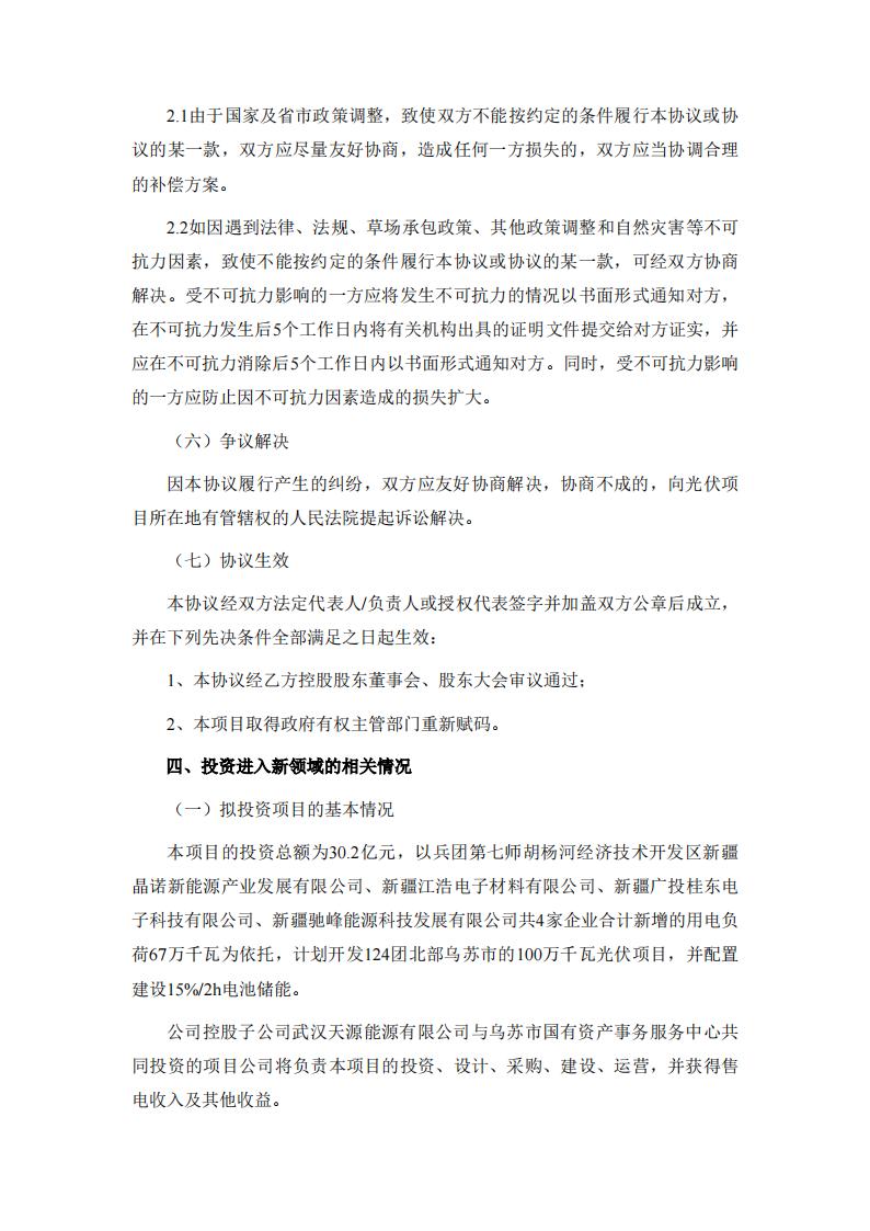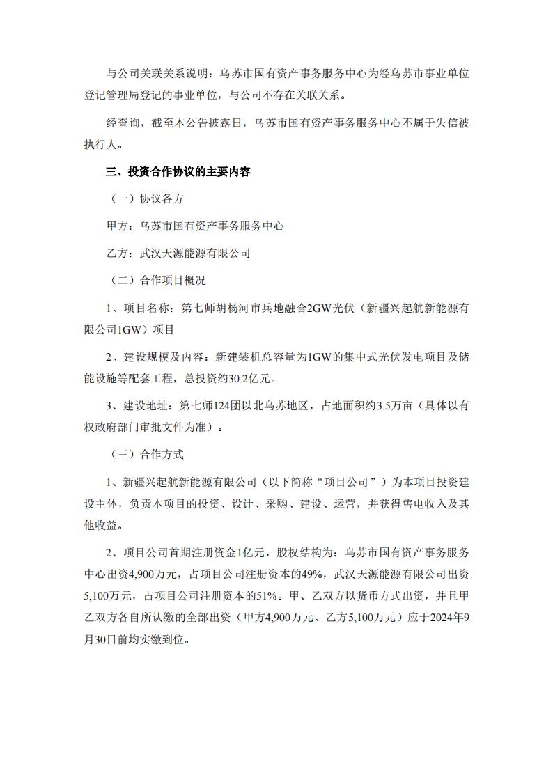 天源环保表示,公司控股子公司武汉天源能源有限公司与乌苏市国有资产事务服务中心拟就投资建设第七师胡杨河市兵地融合2GW光伏(新疆兴起航新能源有限公司1GW)项目签署《第七师胡杨河市兵地融合2GW光伏(新疆兴起航新能源有限公司1GW)项目之投资合作协议》,项目总投资约30.2亿元。