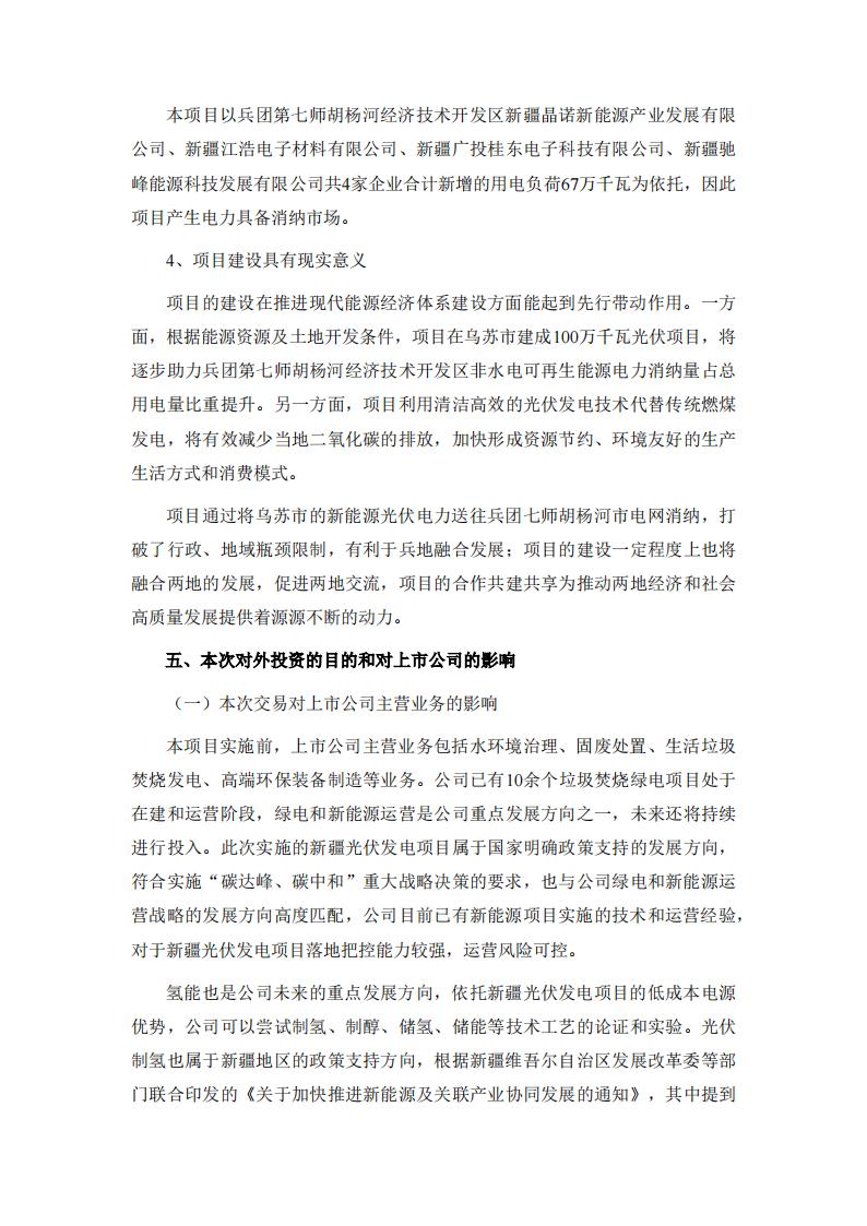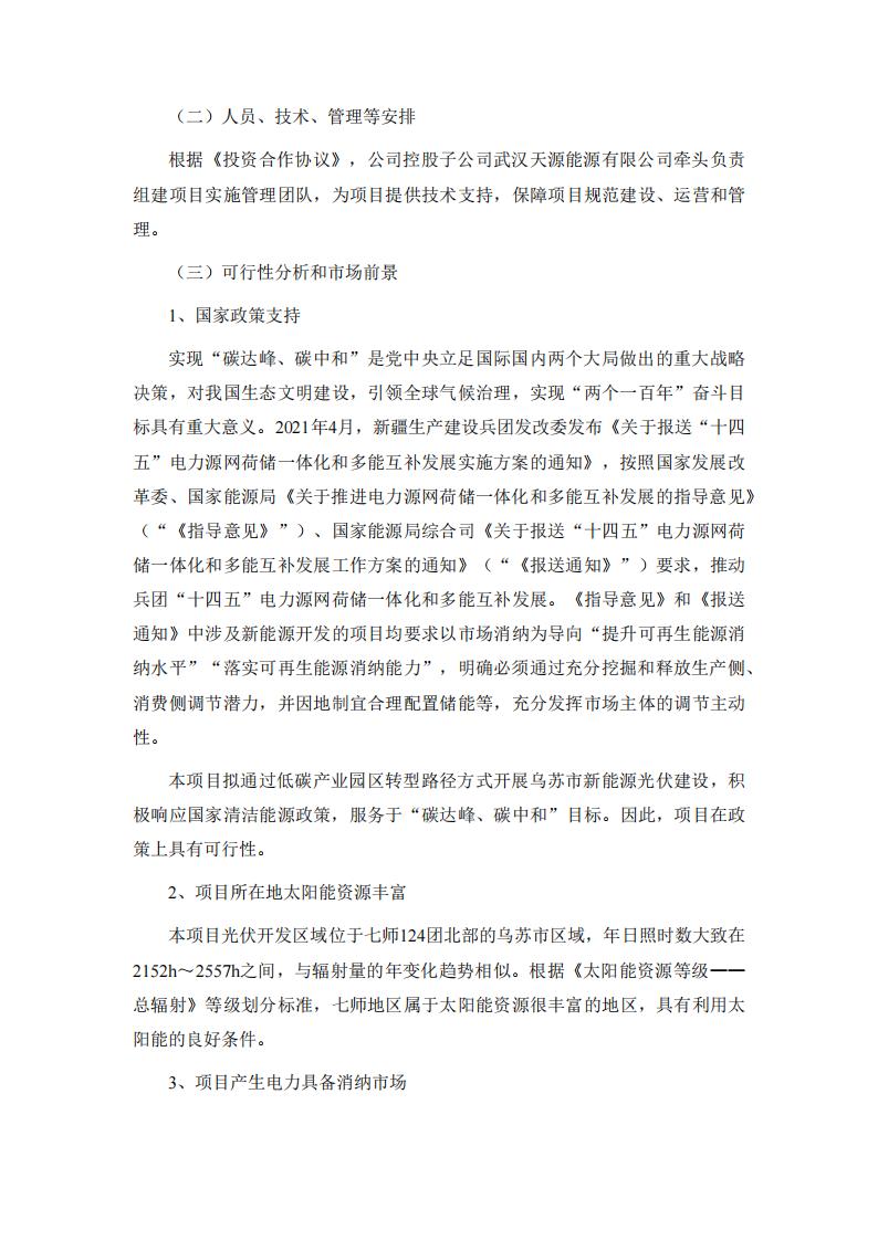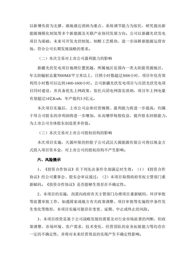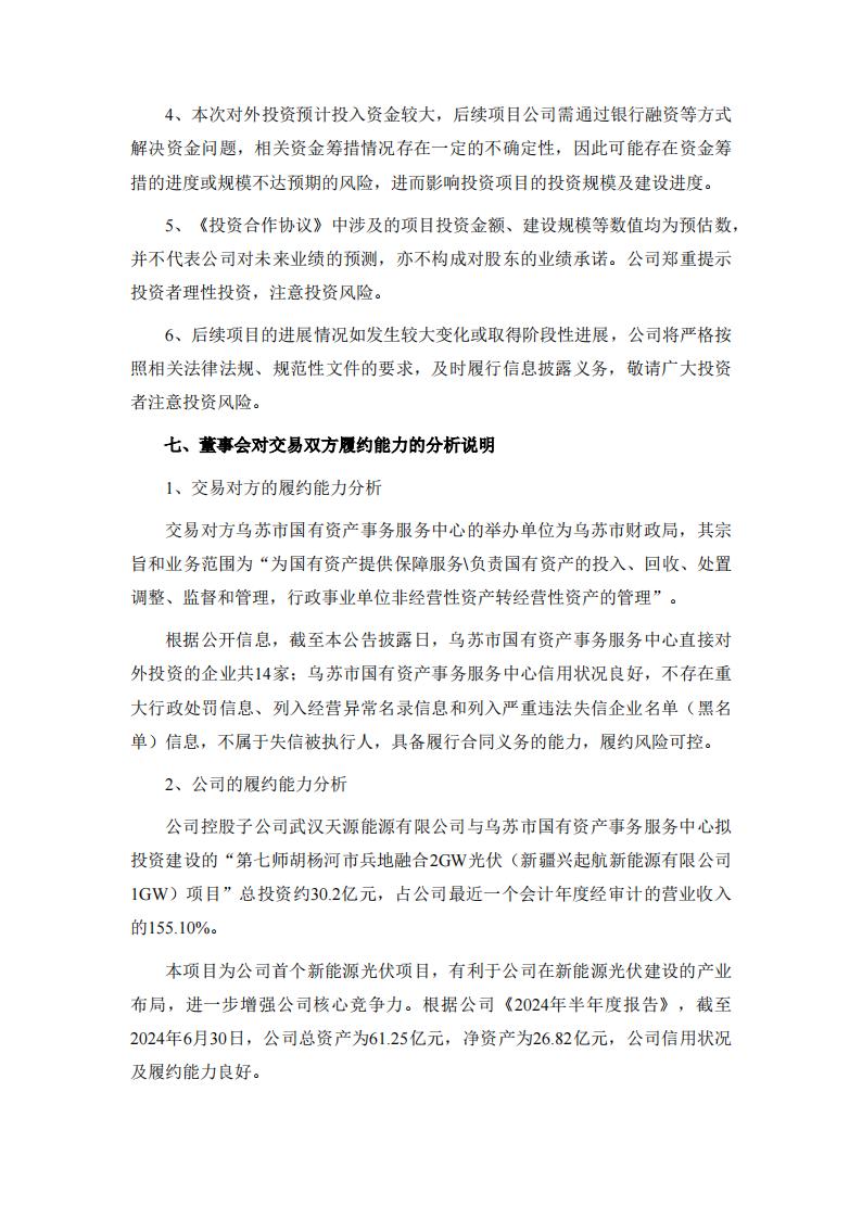 天源环保表示,公司控股子公司武汉天源能源有限公司与乌苏市国有资产事务服务中心拟就投资建设第七师胡杨河市兵地融合2GW光伏(新疆兴起航新能源有限公司1GW)项目签署《第七师胡杨河市兵地融合2GW光伏(新疆兴起航新能源有限公司1GW)项目之投资合作协议》,项目总投资约30.2亿元。