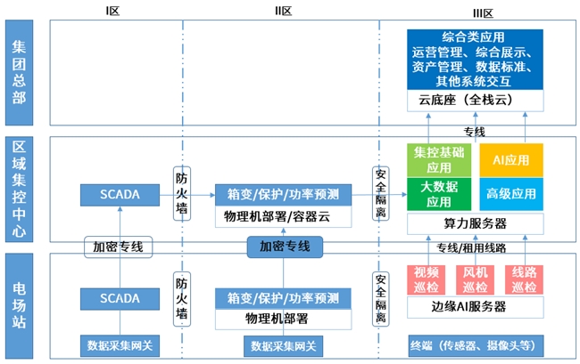 该方案结合远程集中监控、区域运检、无人值班、无人/少人值守的建设目标,采用集团战略运营管控中心+省级/区域运营中心、运检中心+免维护智慧风场站的管理架构。集团侧主要侧重于开放兼容、分层解耦的全栈云服务能力;区域集控站侧以浪潮AI算力机组为底座,高效支撑用户AI、大数据等应用;场站侧通过部署浪潮信息领先的边缘AI服务器,帮助客户打通AI计算的最后一公里。