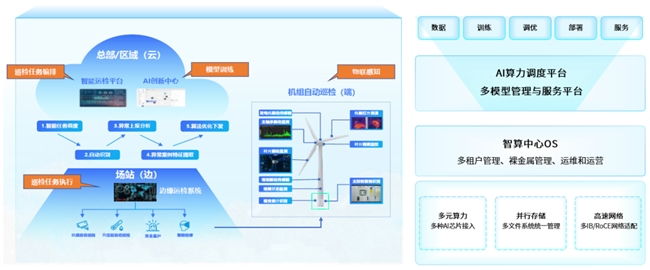 区域集控中心一方面更加注重虚拟化能力,要求开箱即用,按需扩展,支撑集中监视、集中功率预测、生产管理AM、业务智能、售电辅助等区域集控应用,同时浪潮信息提供的AI大底座从根本上解决了电力预测交易模型、风机故障预测模型等在开发过程中的各种问题,包括算力服务、集群的高效调度和故障应急处理,以及训练后的多模型纳管和评测。通过与金风慧能的集中监控系统软件强强联合,高效助力集控站云边协同模式下的自动巡检,实现无人值守业务目标。同时实现场站安全全景感知,联动安防保护场区、人员、周界、资产安全。