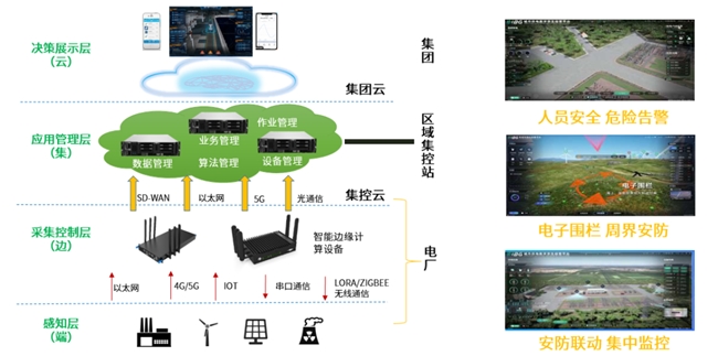 集团、区域集控、电厂构成云-集-边-端协同技术架构,集团侧部署集中式云服务中心,下属若干区域集控站提供业务和数据支撑;集控站是区域云中心,作为全区所有电厂的数据中心、应用中心、管理中心和指挥调度中心,实时监控全区域内所有电厂的巡检态势和实时情况;电厂中控/设备侧部署边缘计算网关,采用机器视觉处理视频图像数据,精确识别巡检问题,通过5G、以太、光通信、SD-WAN等进行上报,物联网关支持多种物联网协议,接入多种传感设备,实时检测电力设备运行状态;电厂生产现场感知层设备包括摄像头、机器人、采集器、仪表等,主要负责收集巡检数据和检测电力设备运行数据。