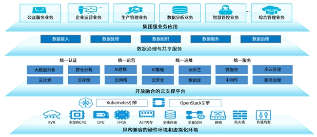 集团侧主要支撑企业经营管理类业务,采用基于OpenStack架构的分布式云操作系统为云底座,提供异构资源纳管能力、数据中台化和业务智能化能力,为集团各类业务提供开放兼容和分层解耦的云服务。浪潮云海的智能计算功能,实现一站式端到端的数智融合,CPU与GPU协同调度实现机器学习与深度学习无缝融合,提升新能源智慧运营系统故障预警模型训练效率和资源使用率。构建开放融合的服务能力体系,打造可持续发展的生态。