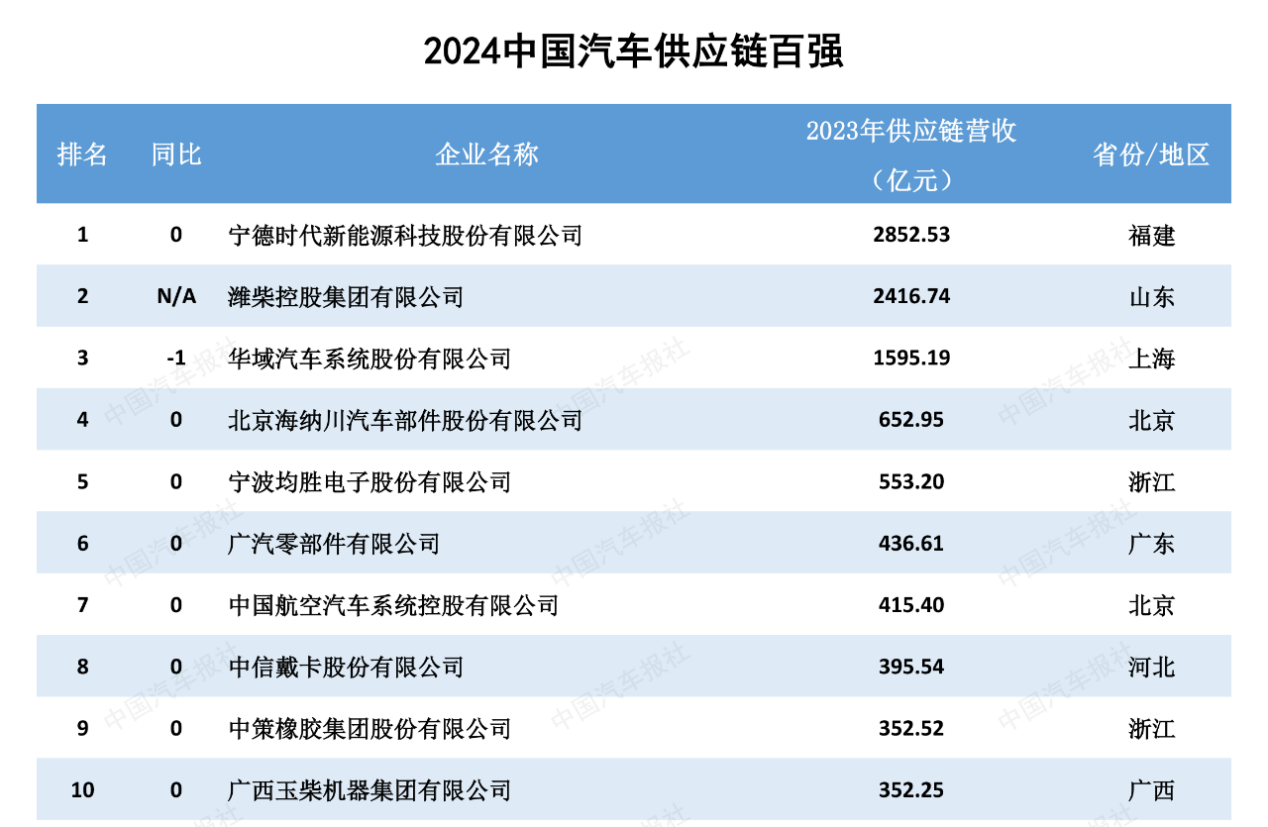 2024中国汽车供应链百强排名前十位的企业分别是宁德时代、潍柴集团、华域汽车、海纳川、均胜电子、广汽部件、中航汽车系统、中信戴卡、中策橡胶和广西玉柴,覆盖了动力电池、传统动力、汽车电子、轮胎、轮毂以及综合性零部件企业。