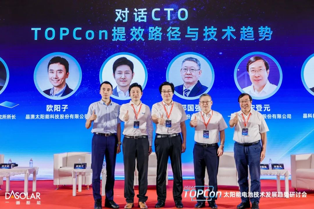 2024年8月16日,中国光伏行业协会主办的“2024 TOPCon太阳能电池技术发展趋势研讨会”在上海召开,会议围绕TOPCon电池技术发展趋势及路径、技术创新及应用、实证发电数据、未来行业格局等议题展开深入讨论。来自中国光伏行业协会的领导、光伏TOP10企业的CTO、行业技术专家、第三方检测机构和设计院、媒体机构等200余人出席会议。一道新能CTO宋登元博士受邀参会,与晶科、晶澳、天合、通威的CTO们共同作为《TOPCon提效路径与技术趋势》圆桌对话嘉宾,对话由上海市太阳能学会名誉理事长、上海交通大学太阳能研究所所长沈文忠教授主持,以下为宋登元博士对话环节发言的内容摘要。