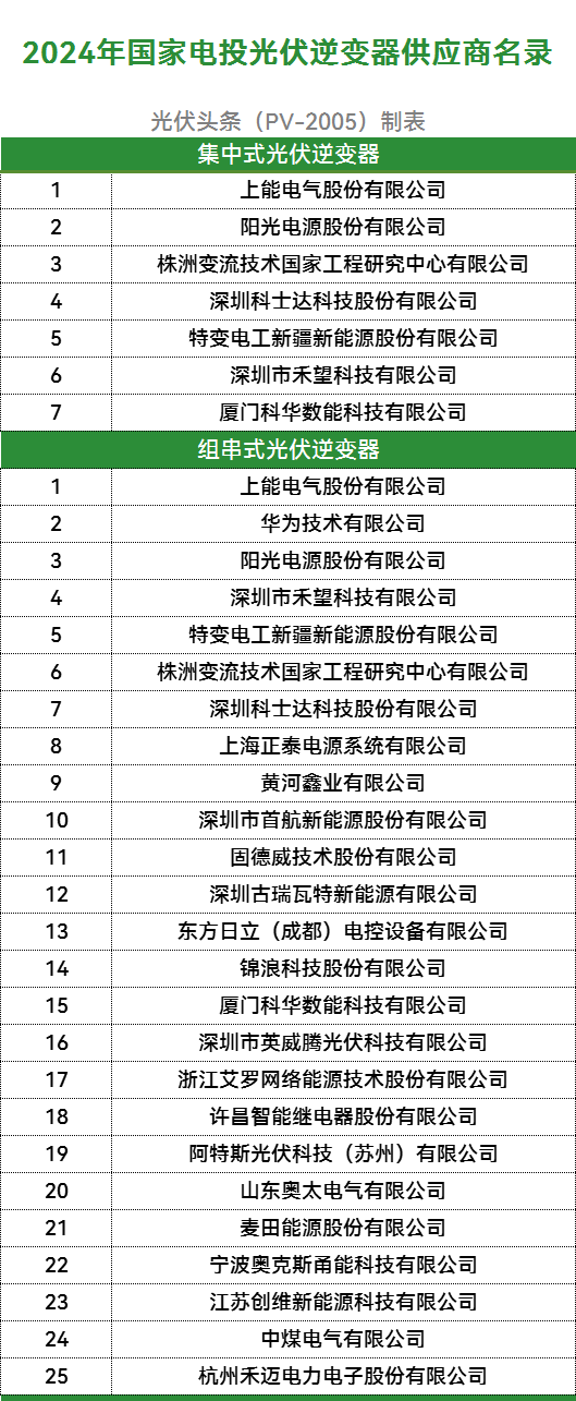 上能电气、华为、阳光电源、禾望电气、特变电工、株洲变流、科士达、正泰电源、黄河鑫业、首航新能、固德威、古瑞瓦特、东方日立(成都)、锦浪科技、科华数能、英威腾、艾罗能源、许继电器、阿特斯、山东奥太电气、麦田能源、宁波奥克斯甬能、江苏创维新能源、中煤电气、禾迈股份等25家企业入围组串式光伏逆变器供应商名录。