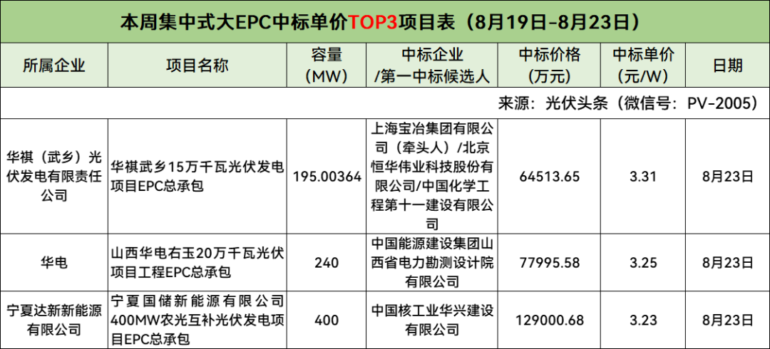 项目第一中标候选人为上海宝冶集团有限公司(牵头人)/北京恒华伟业科技股份有限公司/中国化学工程第十一建设有限公司,投标报价为64513.65万元,投标单价为3.31元/W。