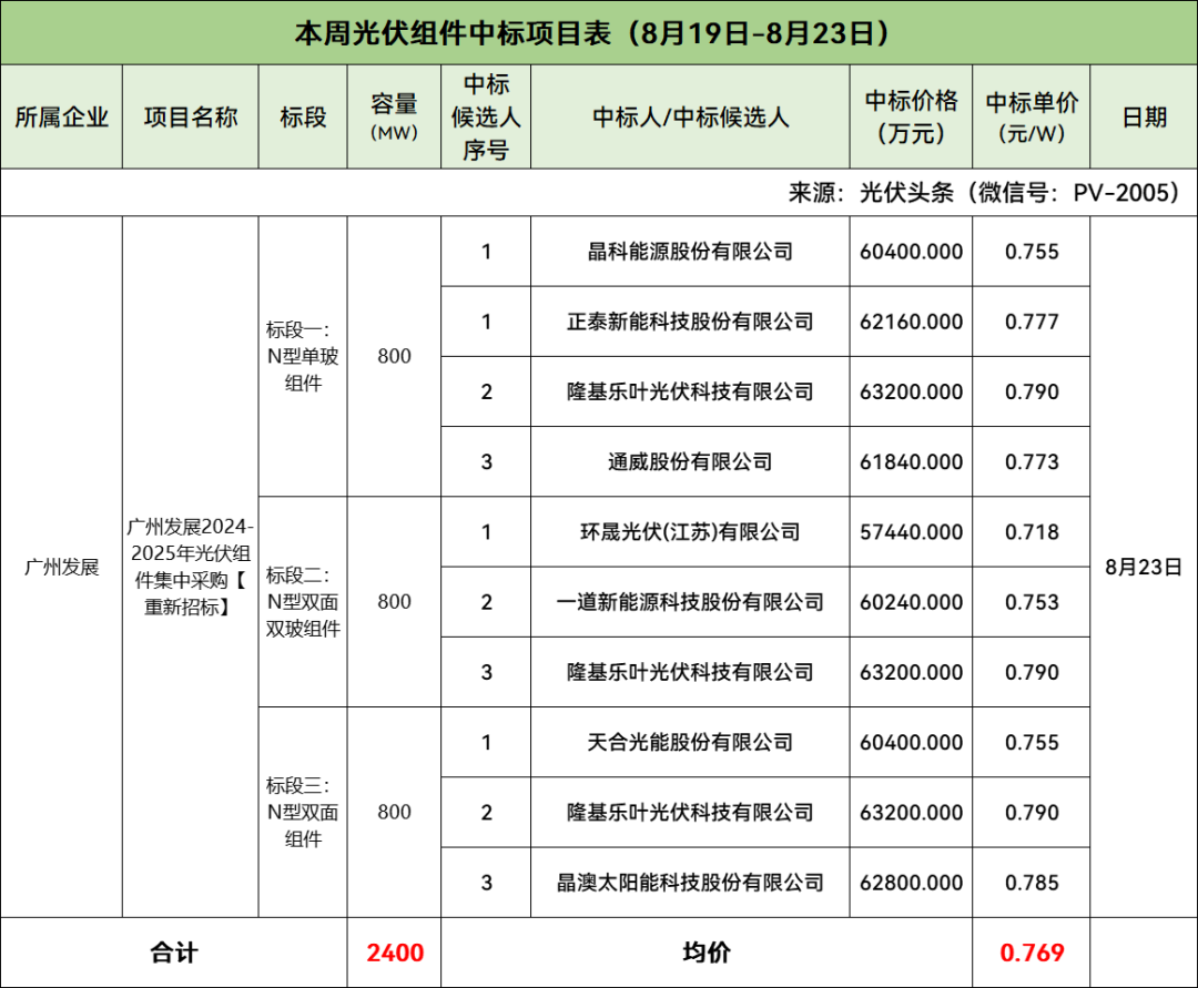 本周广州发展光伏组件中标项目有明确中标价格,合计规模2400MW,中标均价为0.769元/W。