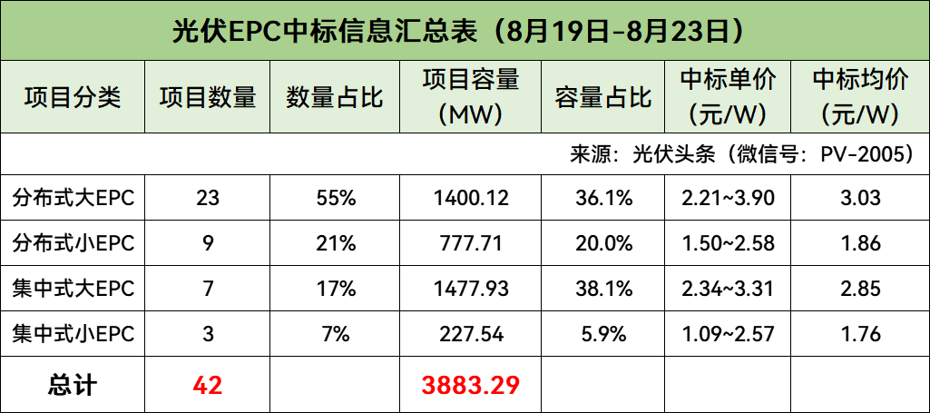 对8月第3周(8月19日-8月23日)光伏EPC招/中标项目不完全统计,本周招标规模合计2528.60MW,中标规模合计3883.29MW,招中标规模合计6411.89MW。