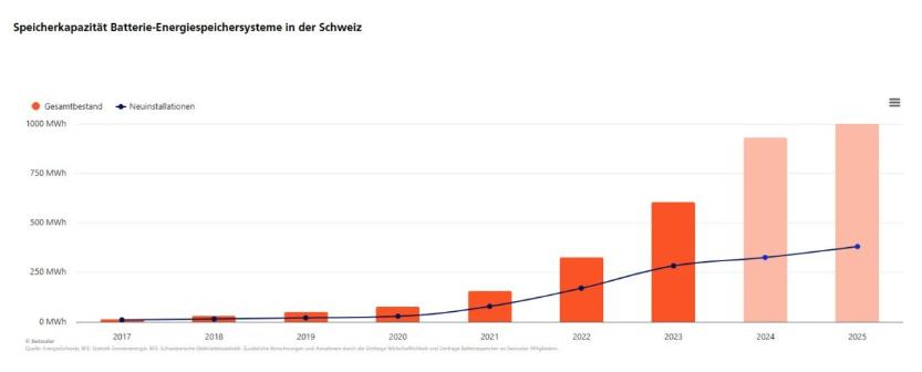 设备价格持续下降是推动家庭储能普及的关键因素。据Swissolar数据,2024年储能设备价格已降至115美元/千瓦时。报告分析2023年新增储能容量接近1吉瓦时,预计这一增长趋势将持续。Swissolar董事总经理Matthias Egli表示:电池储能系统是保障瑞士电力供应安全的重要组成,它们提升了太阳能利用的灵活性,有效缓解了电网压力。目前太阳能约占瑞士能源消费的14%。